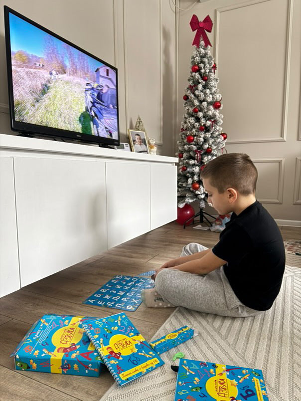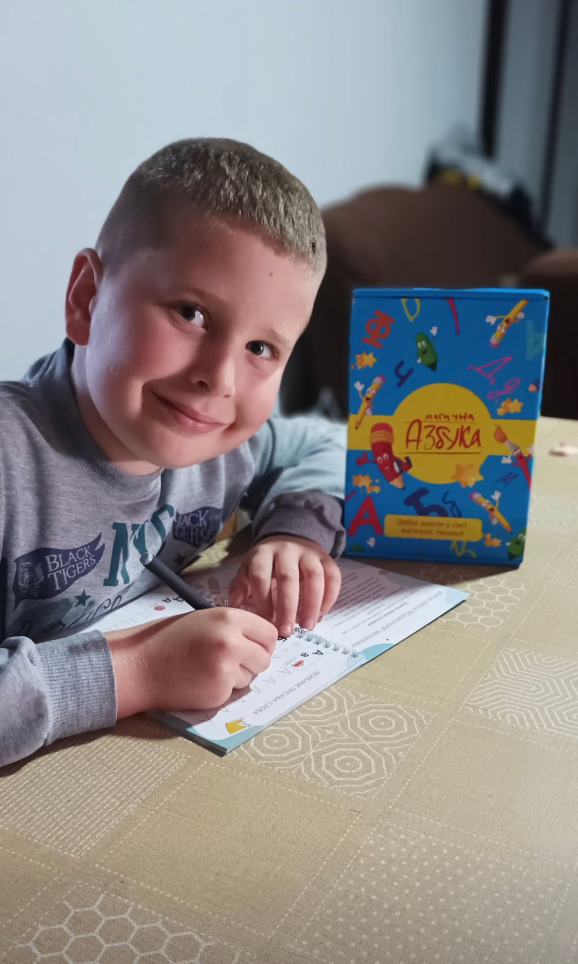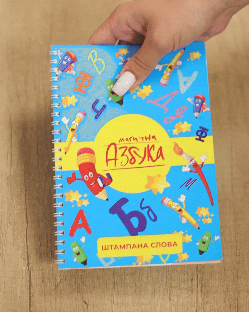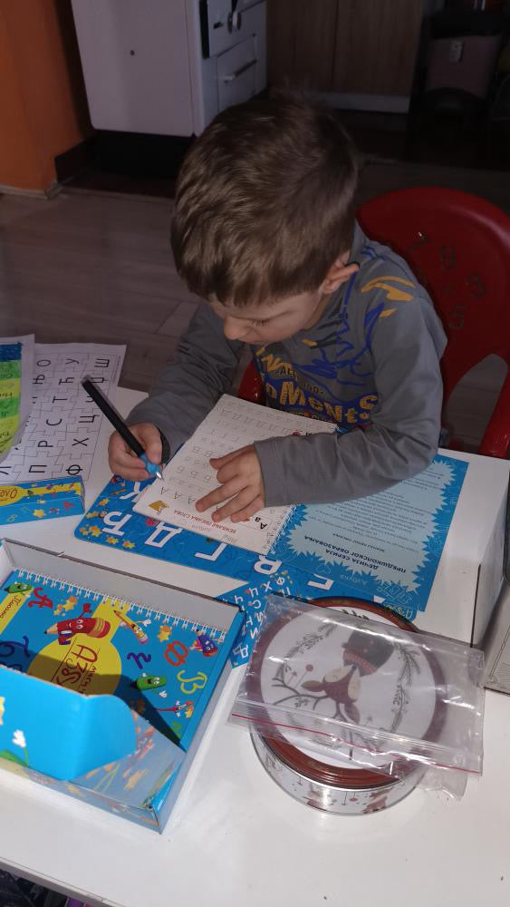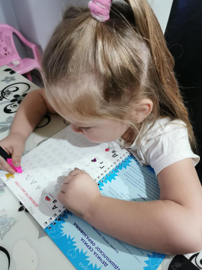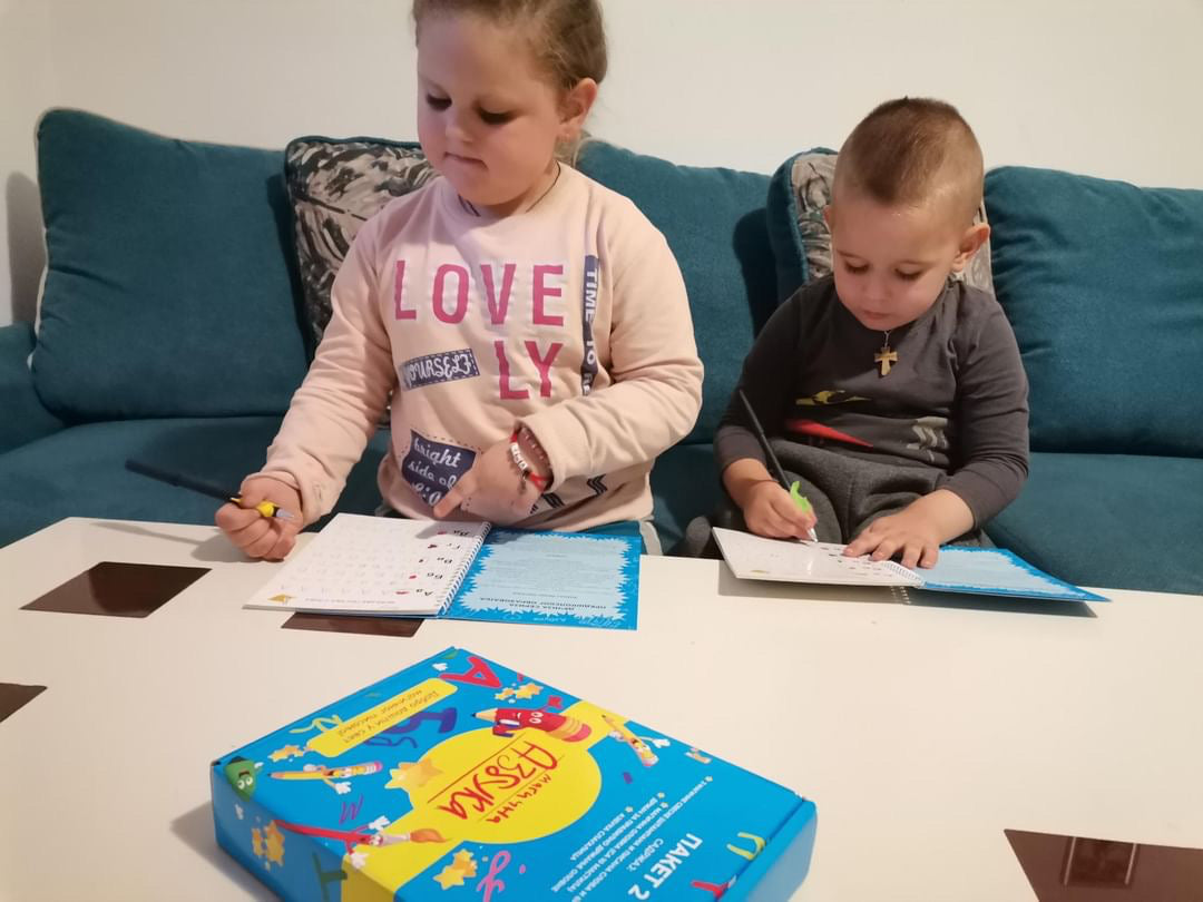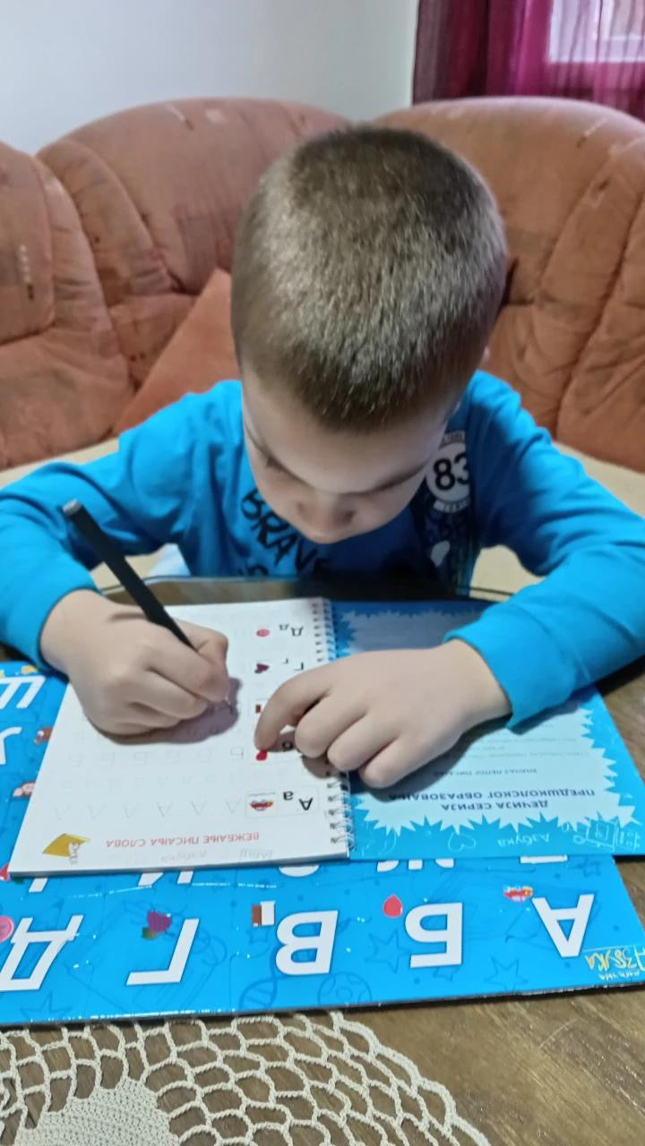 Jedna sveska sa štampanim i jedna sa pisanim slovima ćirilice, sa utisnutim šablonima da dete lakše prati linije i razvija mišićnu motoriku.